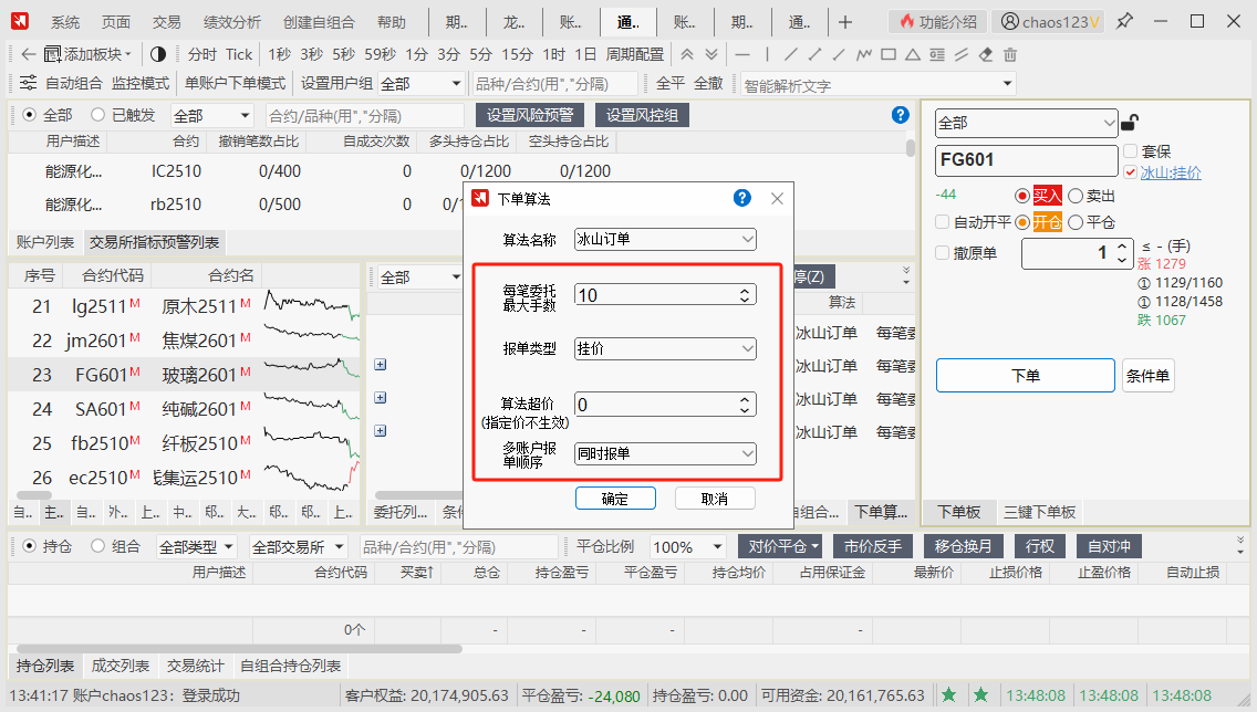 参数简洁且灵活:用户只需设置总委托量和每笔最大委托手数,就能快速启用。其中每笔最大委托手数指单次向市场发出的可见订单数量。用户输入的数值越小,订单越隐匿,但成交速度可能偏慢;设置较大,则成交更快,但隐匿性降低。该参数是冰山算法的核心。